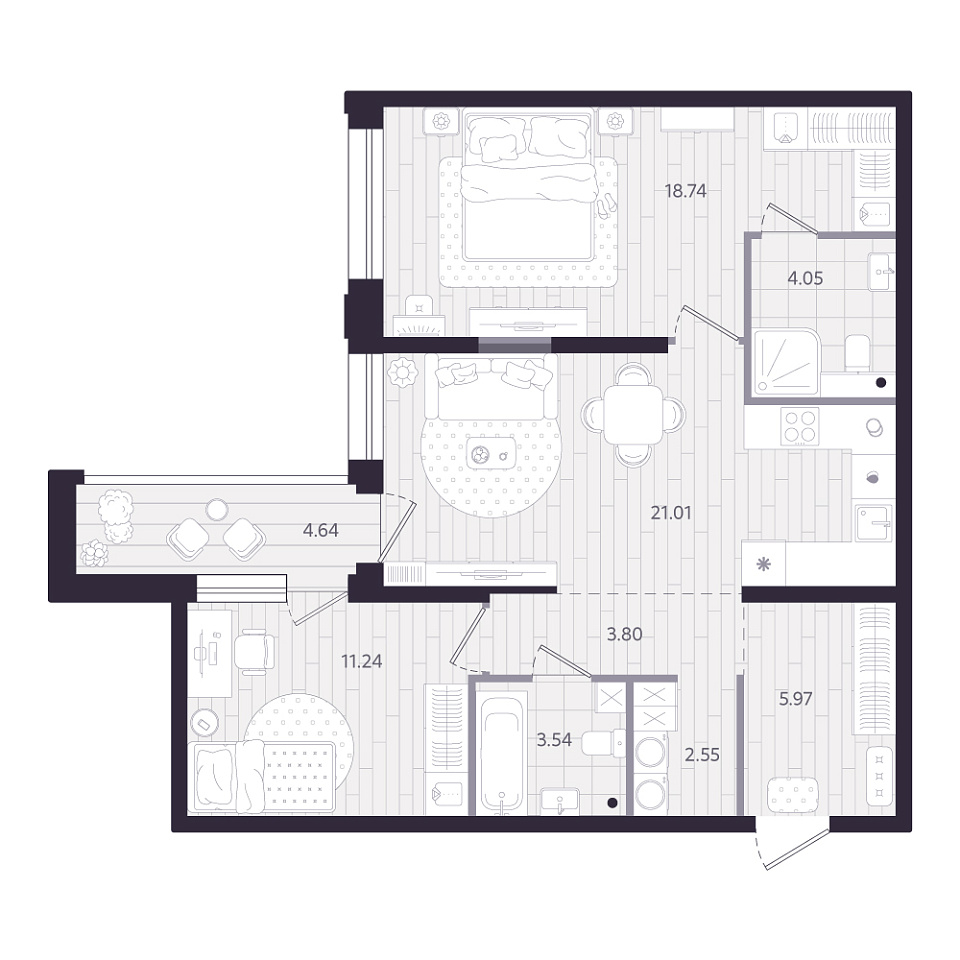 Студии от 28 м² для первых самостоятельных шагов до просторных резиденций до 126 м² для большой семьи.