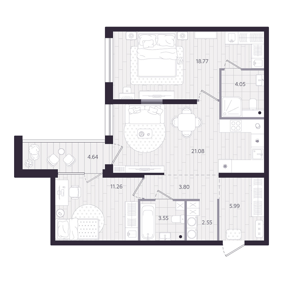 Студии от 28 м² для первых самостоятельных шагов до просторных резиденций до 126 м² для большой семьи.
