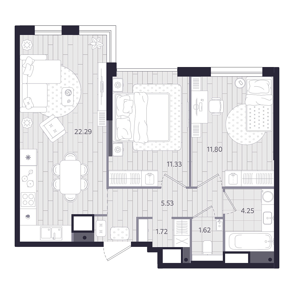 2-комнатная, 58,54м², 7 этаж