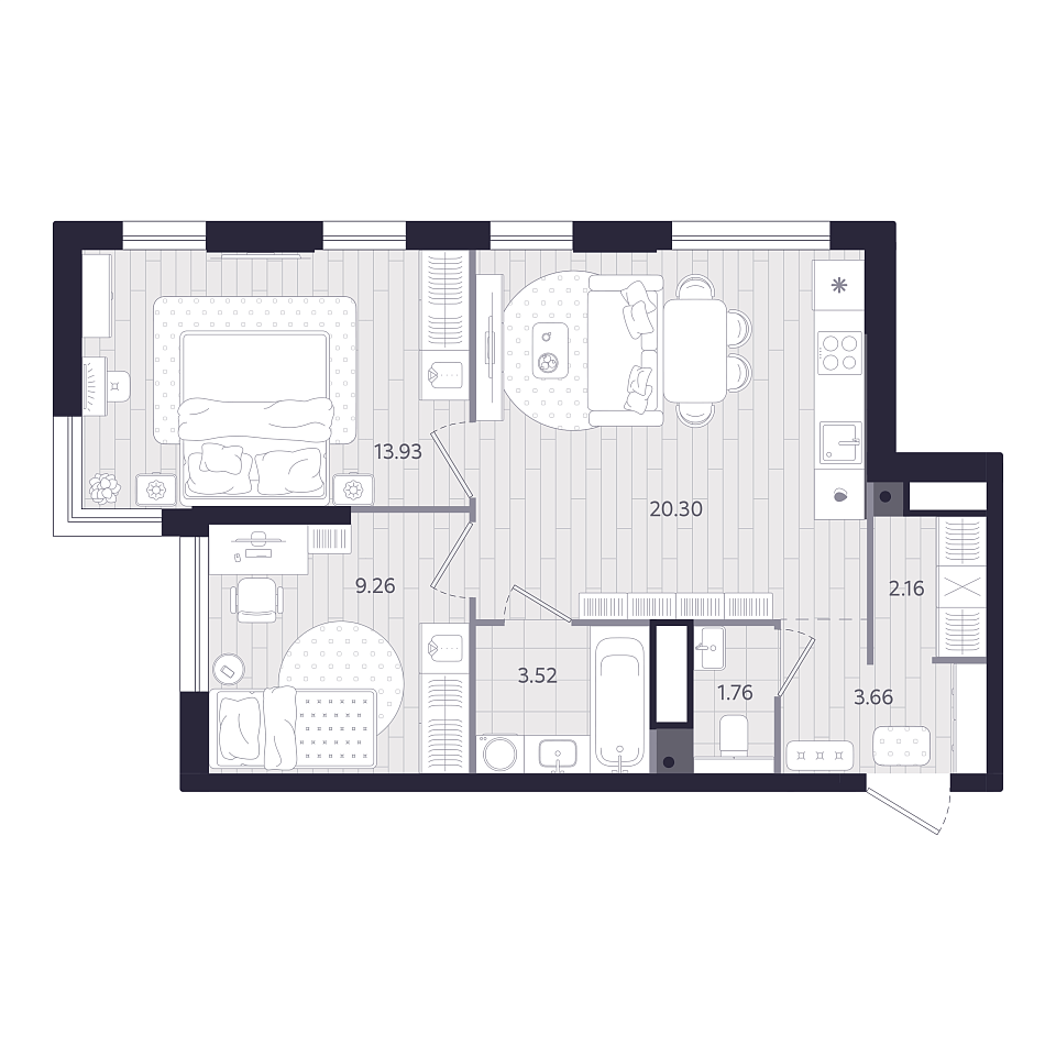 2-комнатная, 54,59м², 12 этаж