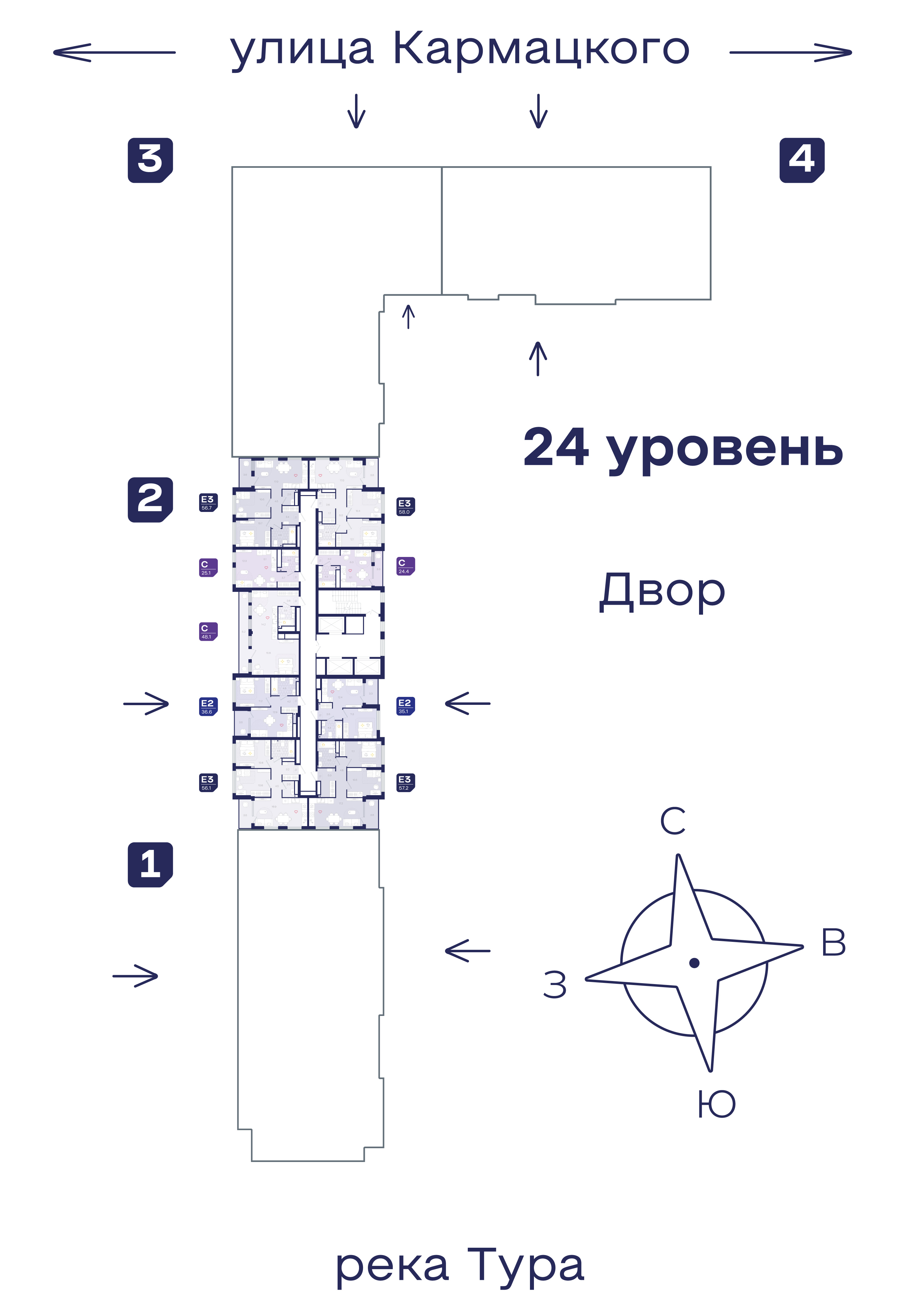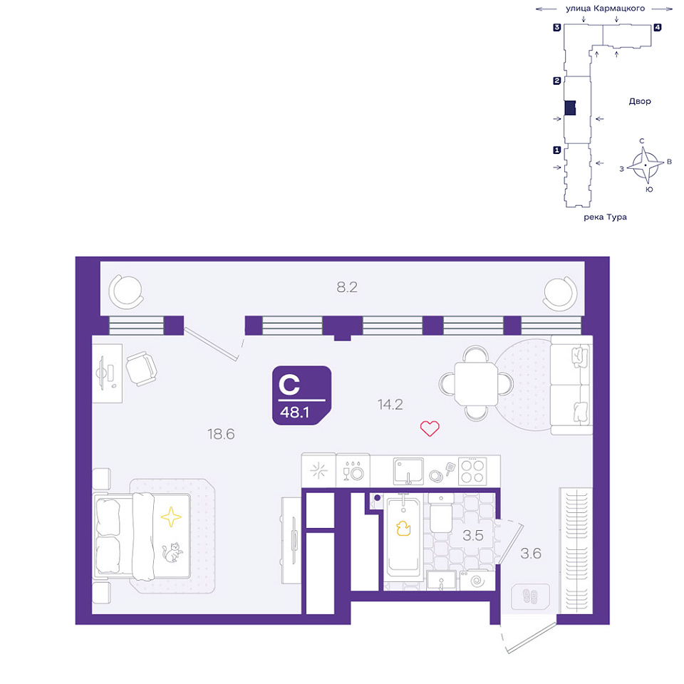 Жилой комплекс расположен на левом берегу Туры по центру между 2 крупных магистралей города, при этом, в окружении парков и озер. Из большинства квартир открываются притягательные виды на реку и город