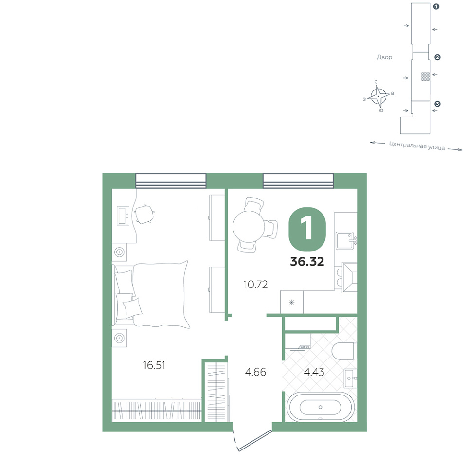 1-комнатная, 36,32м², 4 этаж
