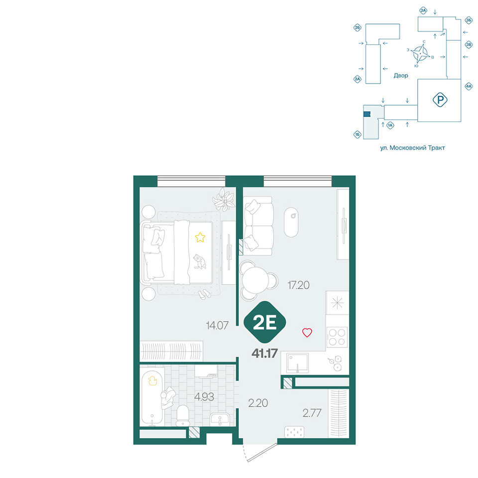 1-комнатная, 41,17м², 17 этаж