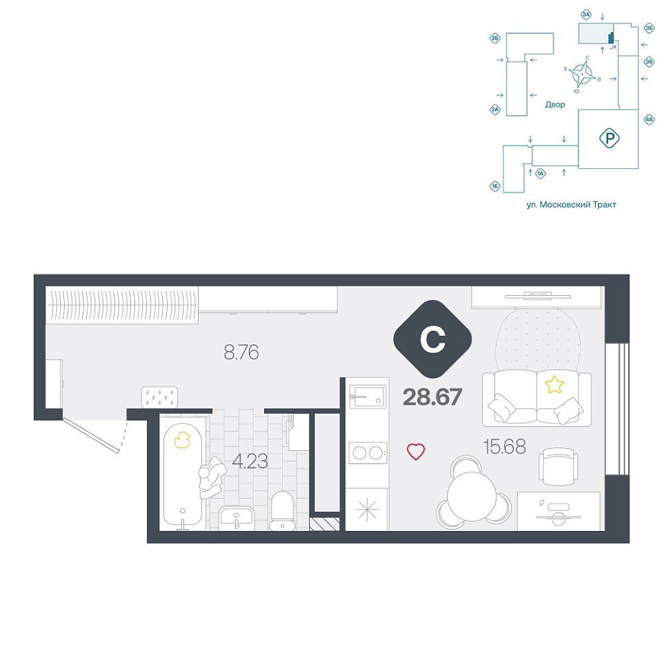 • Площадь, м² 28.67 м²