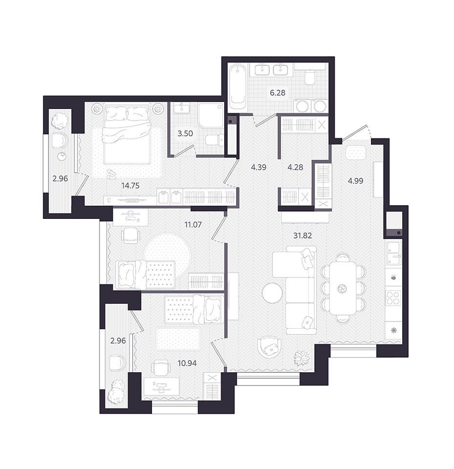 3-комнатная, 93,8м², 15 этаж
